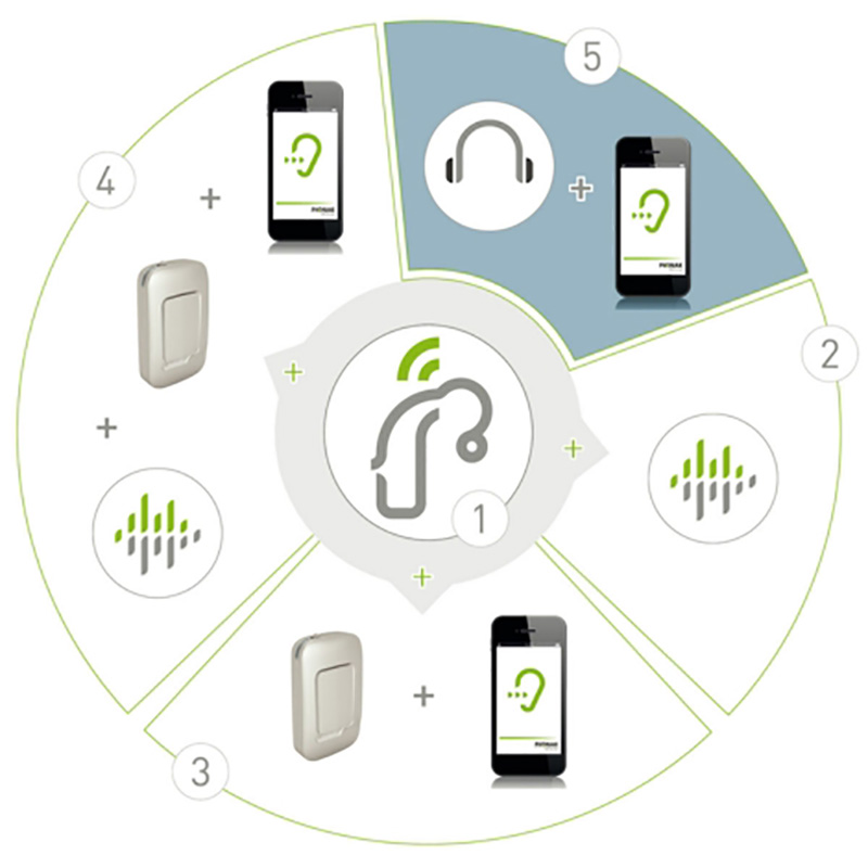 Ezt bővíti ki a vezeték nélküli kiegészítő, ami összeköti a hallókészülékét az okostelefonnal és más elektronikus eszközökkel: tévével, laptoppal, tablettel. Ez biztosítja, hogy az eszközökről a hangok a hallókészülékbe továbbítódjanak, és jó minőségben hallja a zene, a film vagy a terápiás dallam hangját.
